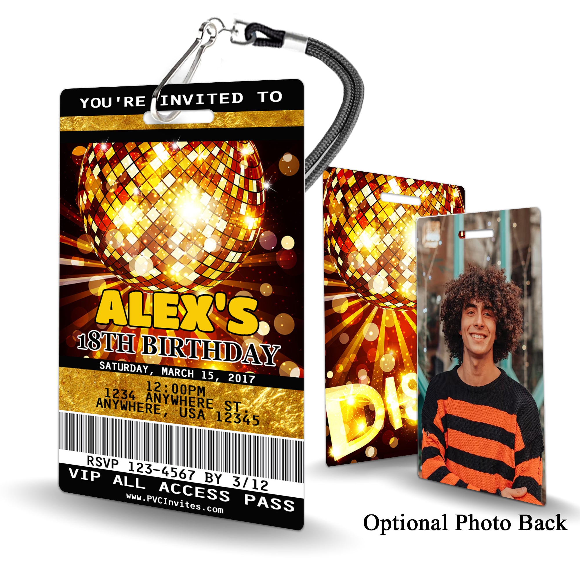 Each invitation is beautifully printed on both sides of a thick 30 mil PVC plastic card and includes a black lanyard.  If you choose to use your child's photo on the back, please make sure the photo is a high resolution photo.  Please consider the space above your child’s head for the hole to be punched through for the lanyard, see example.