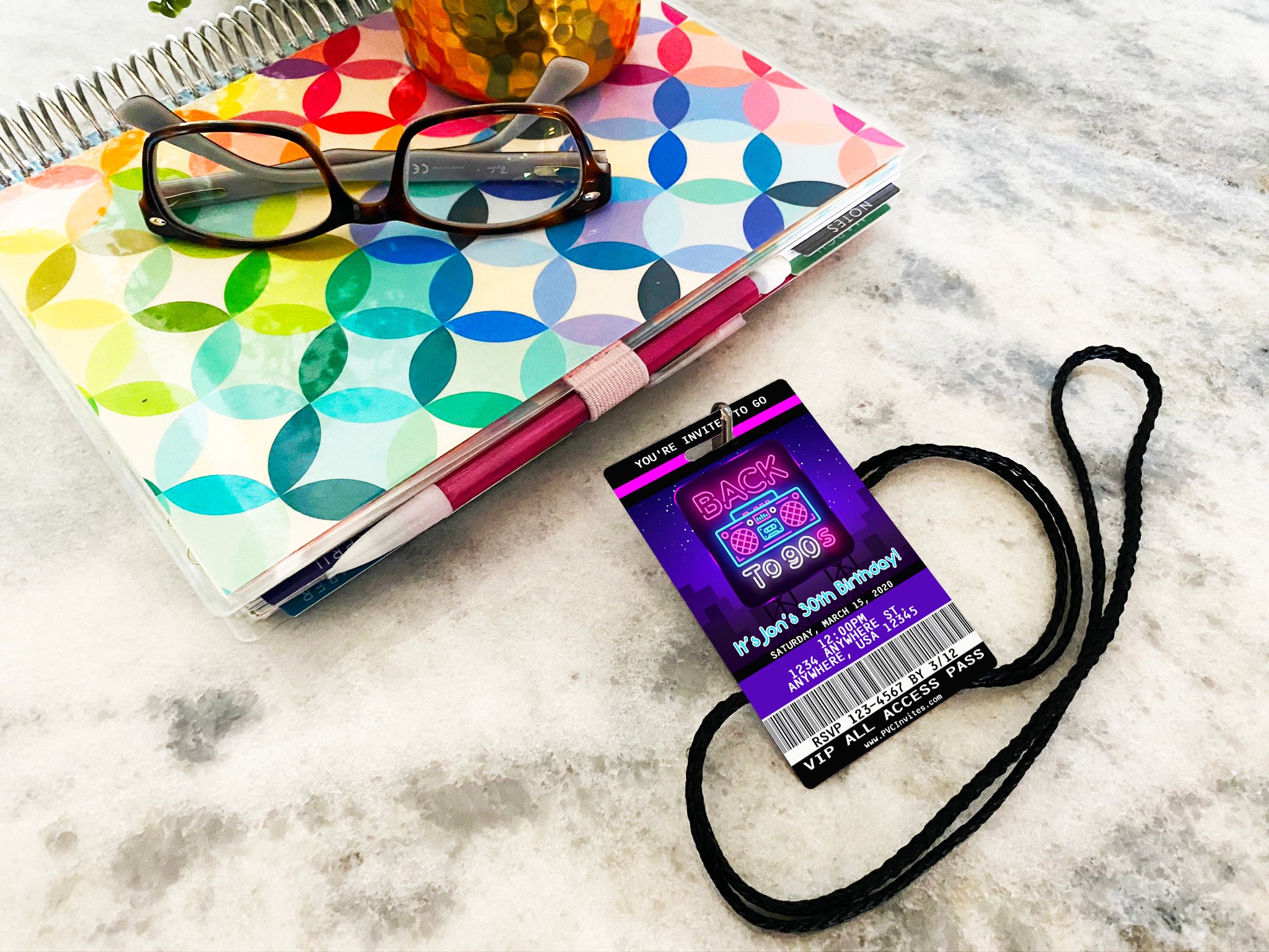 Each invitation is beautifully printed on both sides of a thick 30 mil PVC plastic card and includes a black lanyard.  If you choose to use your child's photo on the back, please make sure the photo is a high resolution photo.  Please consider the space above your child’s head for the hole to be punched through for the lanyard, see example.