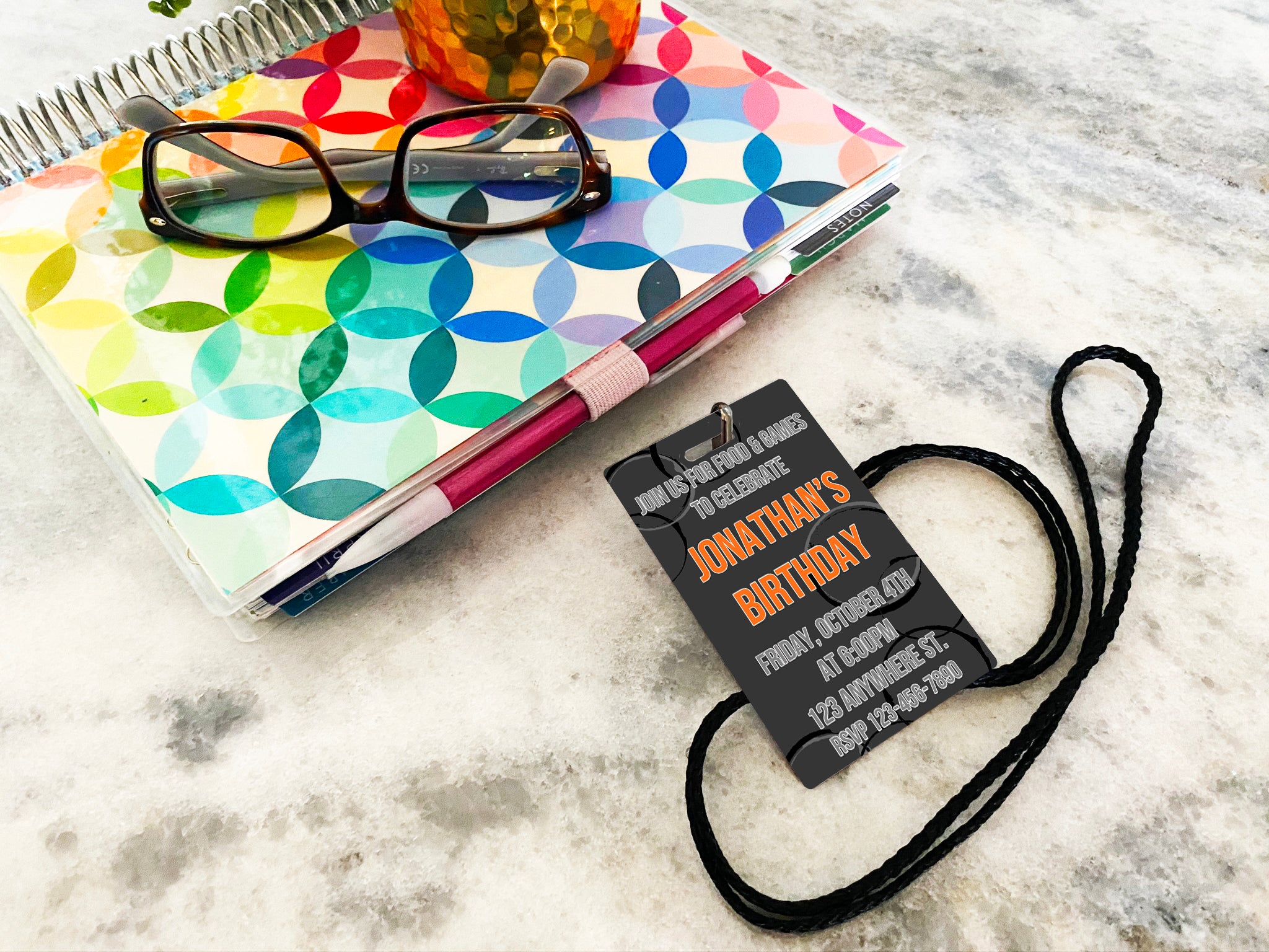 Each invitation is beautifully printed on both sides of a thick 30 mil PVC plastic card and includes a black lanyard.  If you choose to use your photo on the back, please make sure the photo is a high resolution photo.  Please consider the space at the top of the photo to allow room for the hole punch, see example.