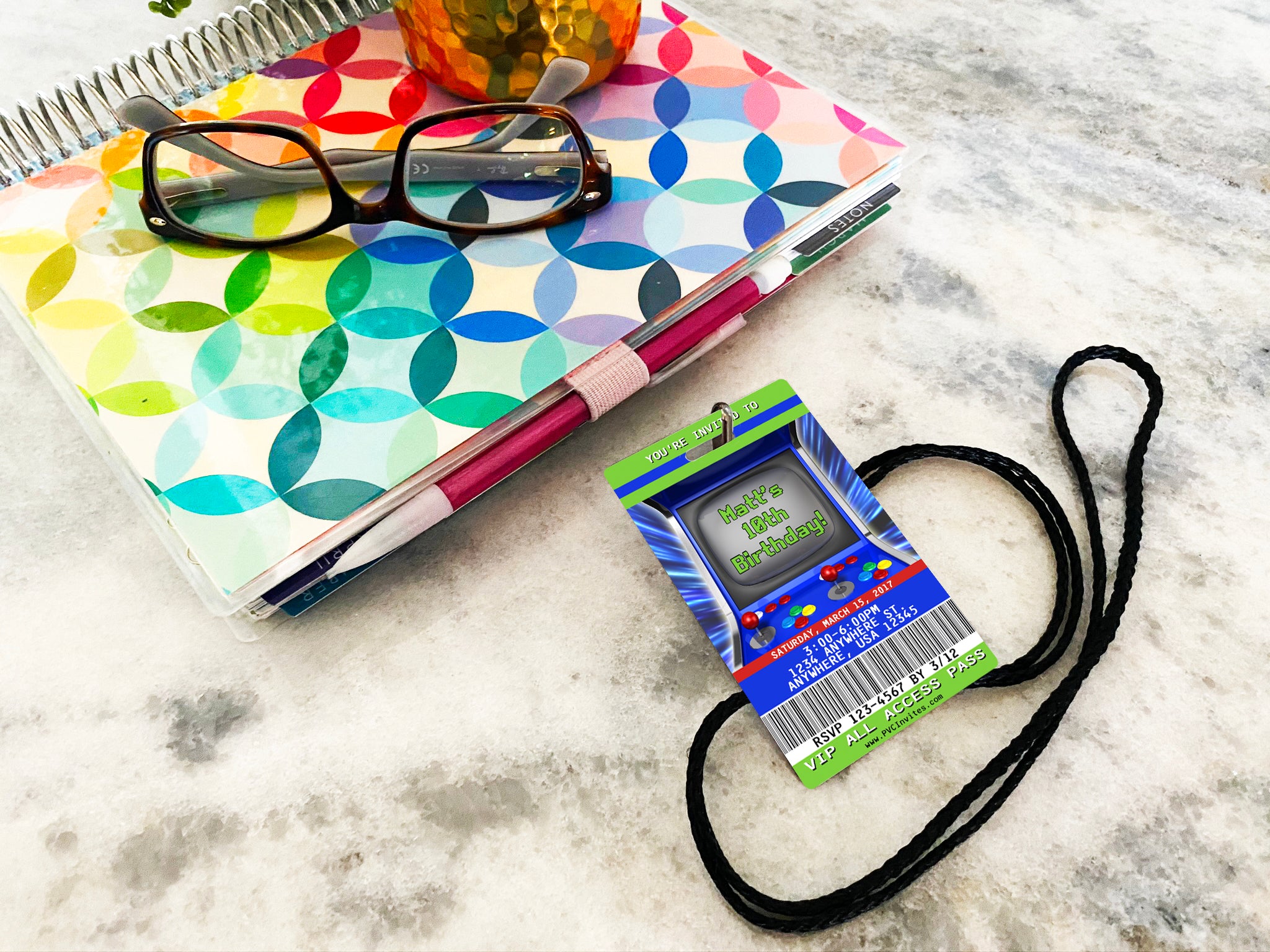Level up your party with Arcade Birthday Invitations. Perfect for video game-themed celebrations. Each invitation is beautifully printed on both sides of a thick 30 mil PVC plastic card and includes a black lanyard. If you choose to use your child's photo on the back, please make sure the photo is a high resolution photo. Please consider the space above your child’s head for the hole to be punched through for the lanyard, see example.