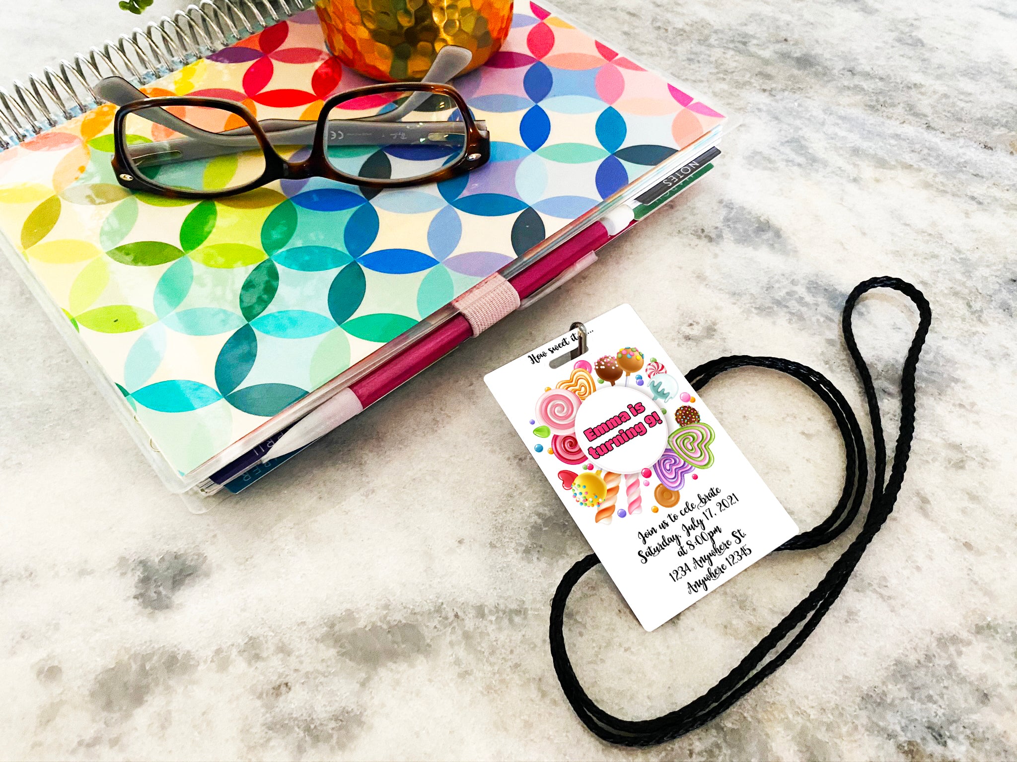 Each invitation is beautifully printed on both sides of a thick 30 mil PVC plastic card and includes a black lanyard.  If you choose to use your child's photo on the back, please make sure the photo is a high resolution photo.  Please consider the space above your child’s head for the hole to be punched through for the lanyard, see example.