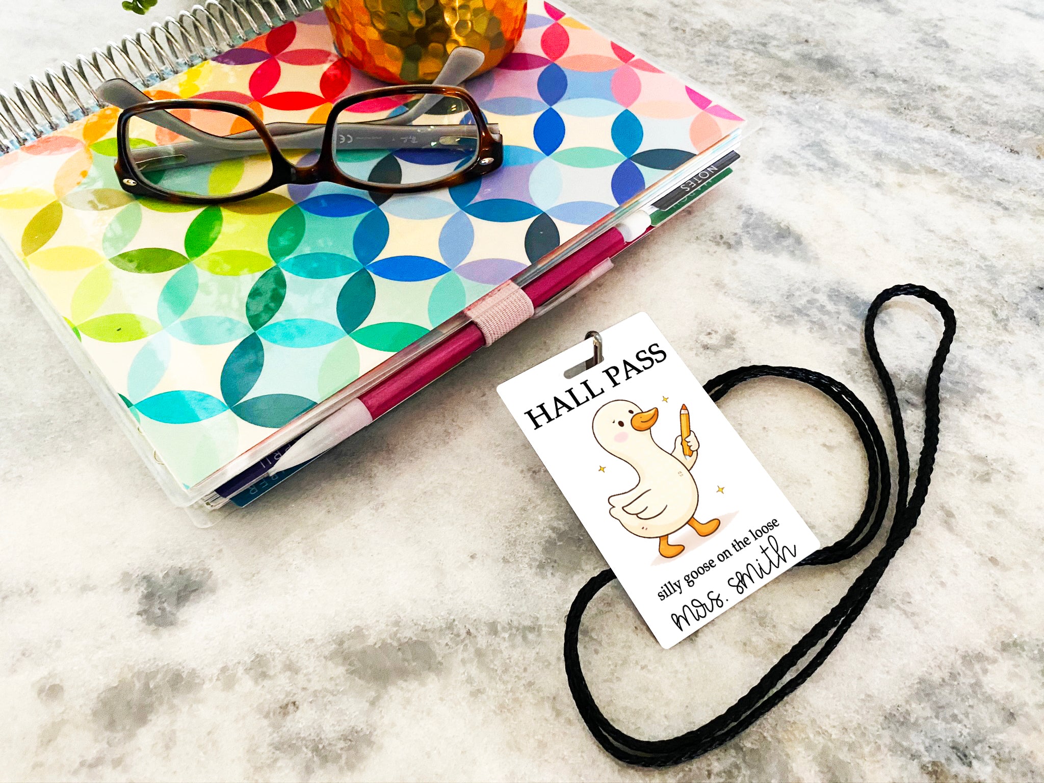 Each personalized classroom hall pass is beautifully printed on both sides of a thick 30 mil PVC plastic card.